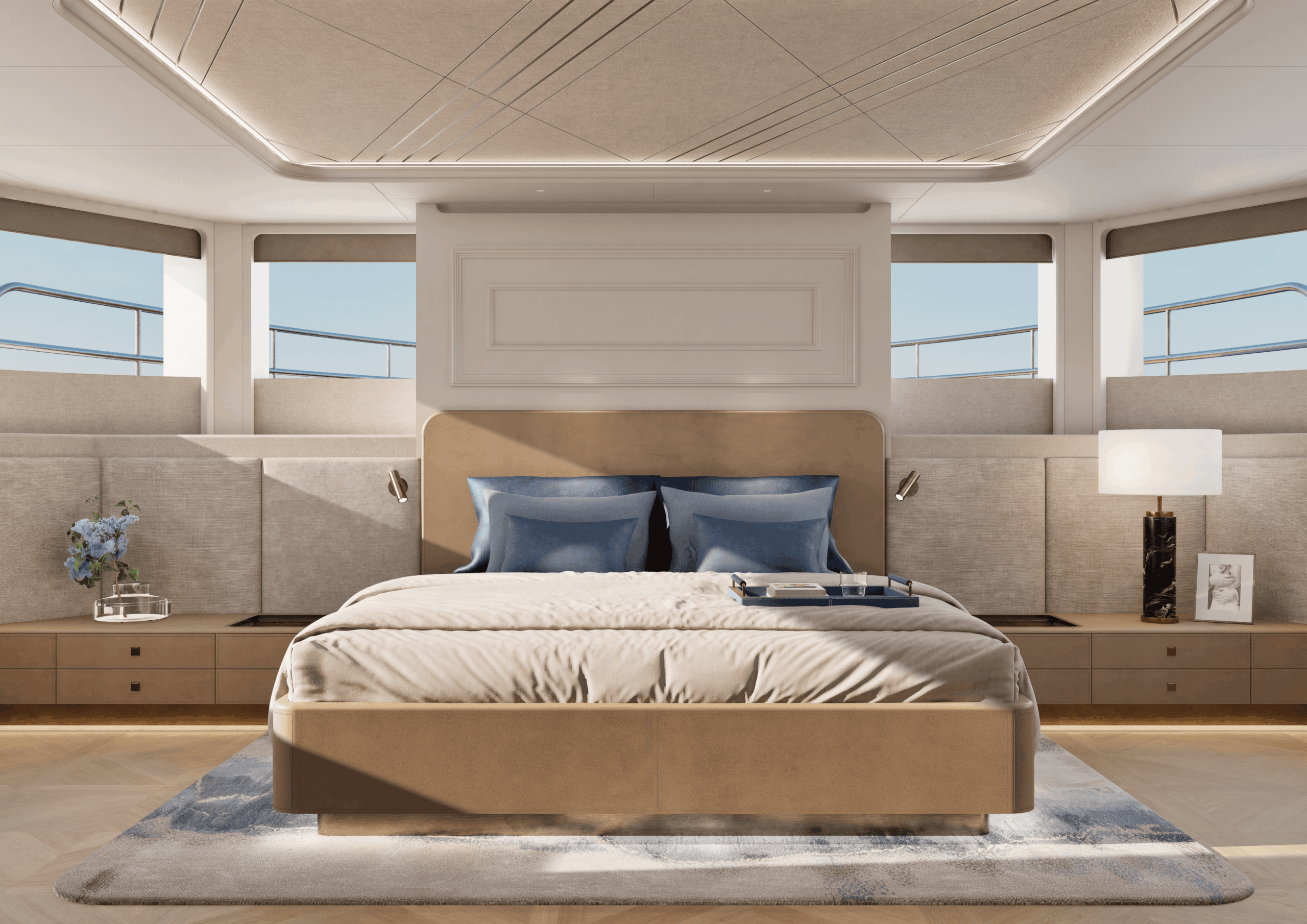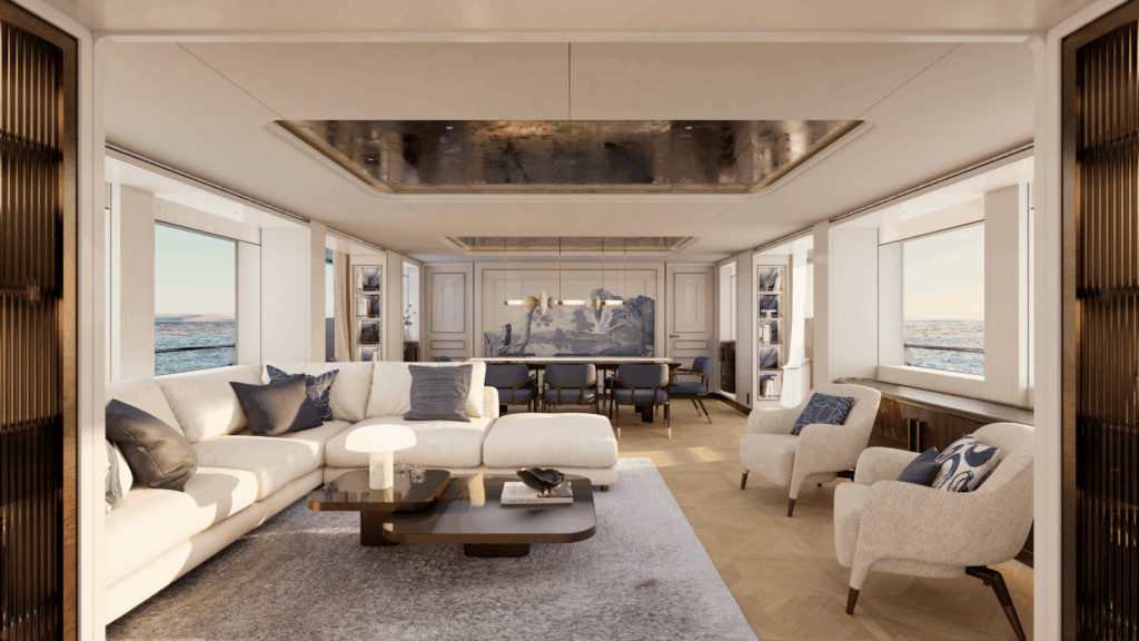 Key interior highlights include a full-beam Owner’s Stateroom (37m² / 398ft²) on the Main Deck, forward-facing windows with breathtaking 180-degree views, and an expansive Galley and Pantry ensuring a world-class dining experience.
