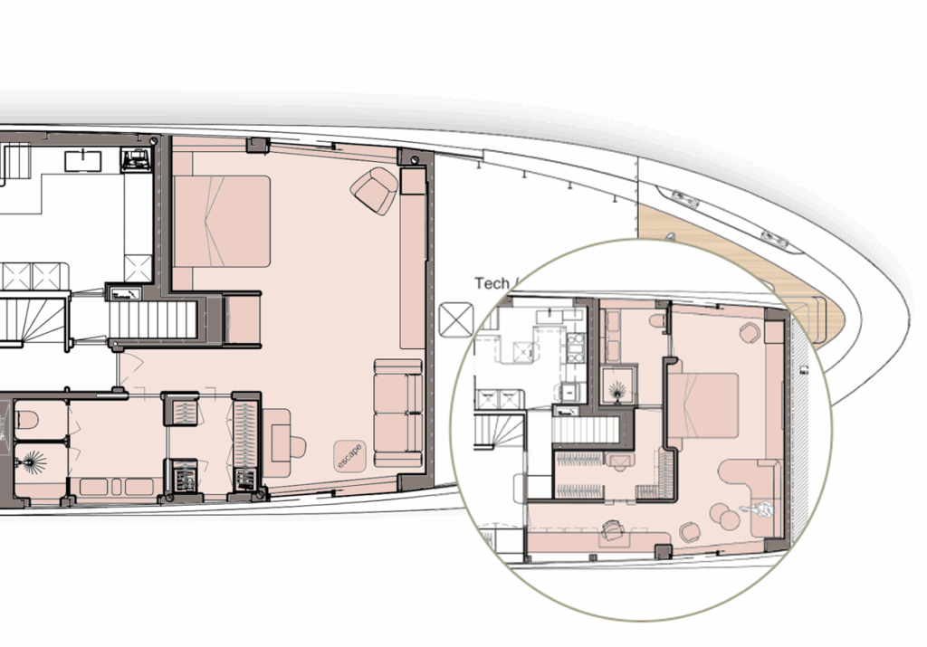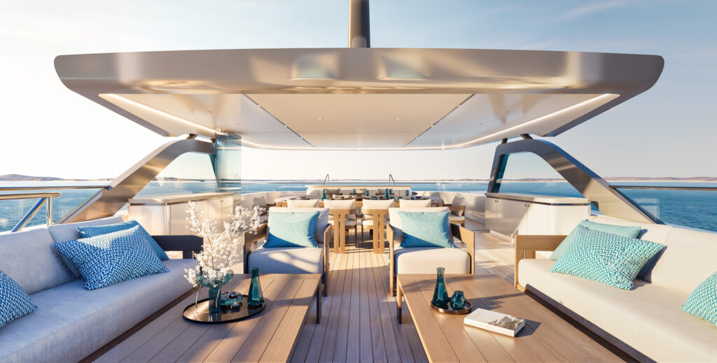 The 133 Mallorca can be provided with an interior beach club aft or alternatively a stepped aft-deck pool area with openable bulwarks to create a terrace on the sea.