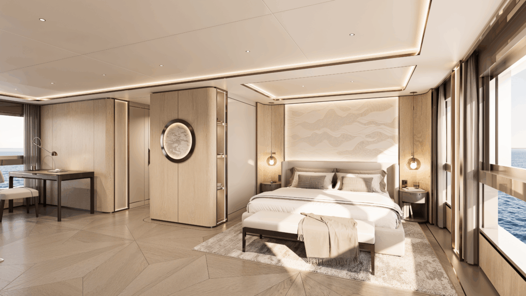 The comfortable and customisable interior, conceived specifically for the Mallorca, is penned by Dutch design studio Vripack Yacht Design. It’s defined by a relaxed yet sophisticated character, and includes a distinctive asymmetric Owner’s Stateroom, with the bed positioned to port and a walk-in dressing room and ensuite to starboard. Alternatively, the bed can be placed centrally and forward of the walk-in dressing room and ensuite, with a more traditional starboard-side entrance. Full height windows, integrated storage and multiple dining options create a sociable environment for both relaxing and entertaining.