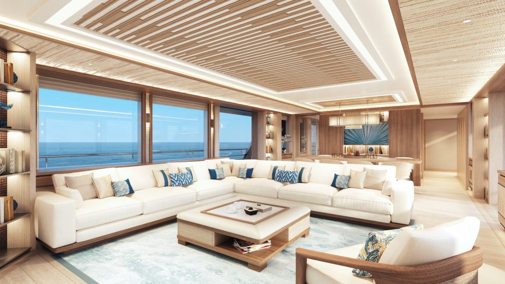 Hollander Yacht Design’s Barefoot Luxury concept has a coastal modern feel, with light woods and relaxed loose furniture that create a beach villa aesthetic. View